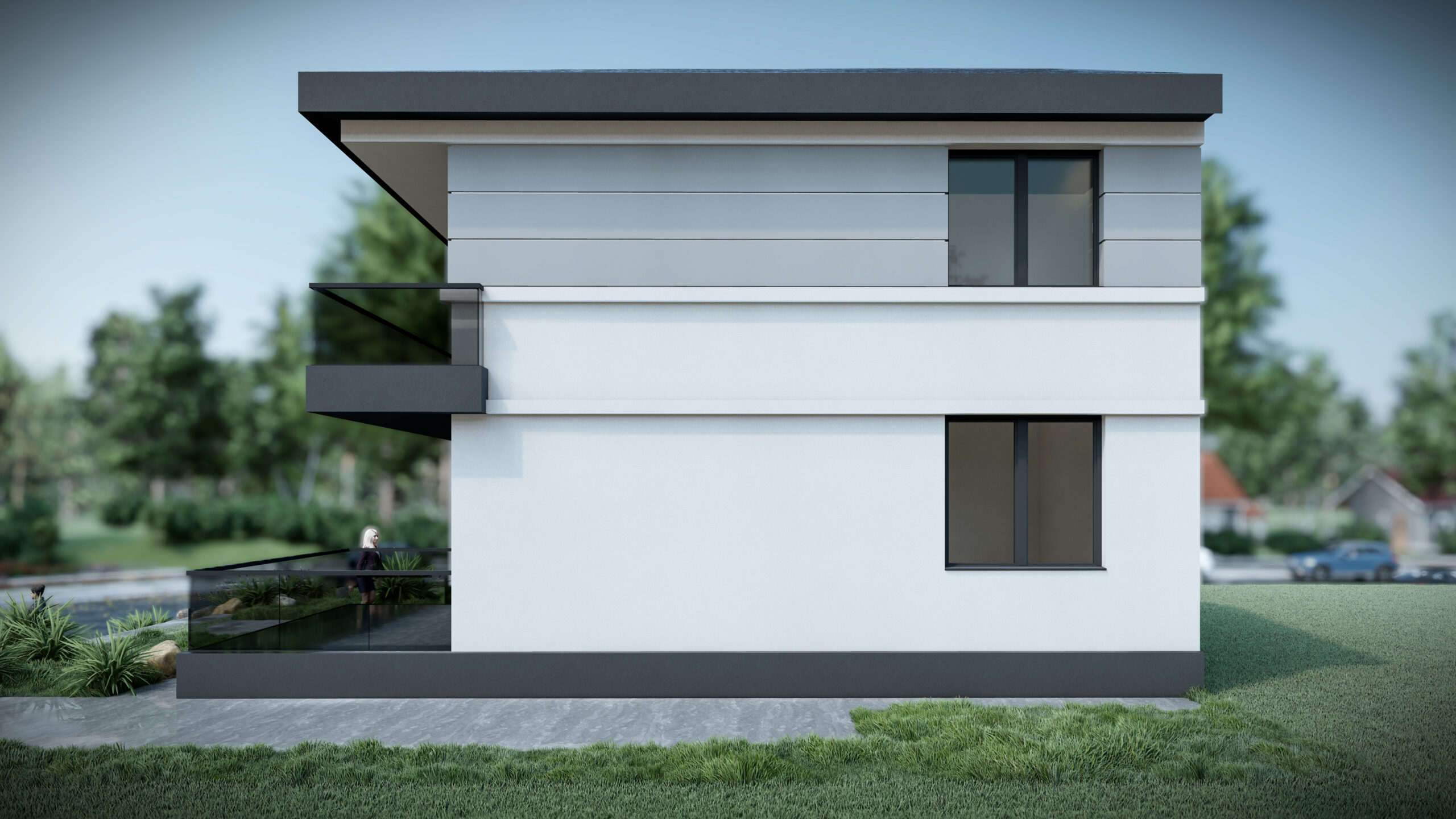 Acest proiect propune construcția unei locuințe unifamiliale moderne, dispusă pe două niveluri (P+1E), amplasată pe un teren de 213 mp. La nivelul parterului, este prevăzut un birou destinat profesiunilor liberale, oferind flexibilitate și funcționalitate pentru activități profesionale, într-un spațiu dedicat. La etaj, spațiile de locuit sunt optimizate pentru a oferi confort și intimitate unei familii moderne. Zona de zi este bine conectată cu exteriorul prin suprafețele vitrate generoase, iar materialele folosite sunt durabile și estetice, contribuind la integrarea armonioasă în peisajul urban, cu zone verzi amenajate.