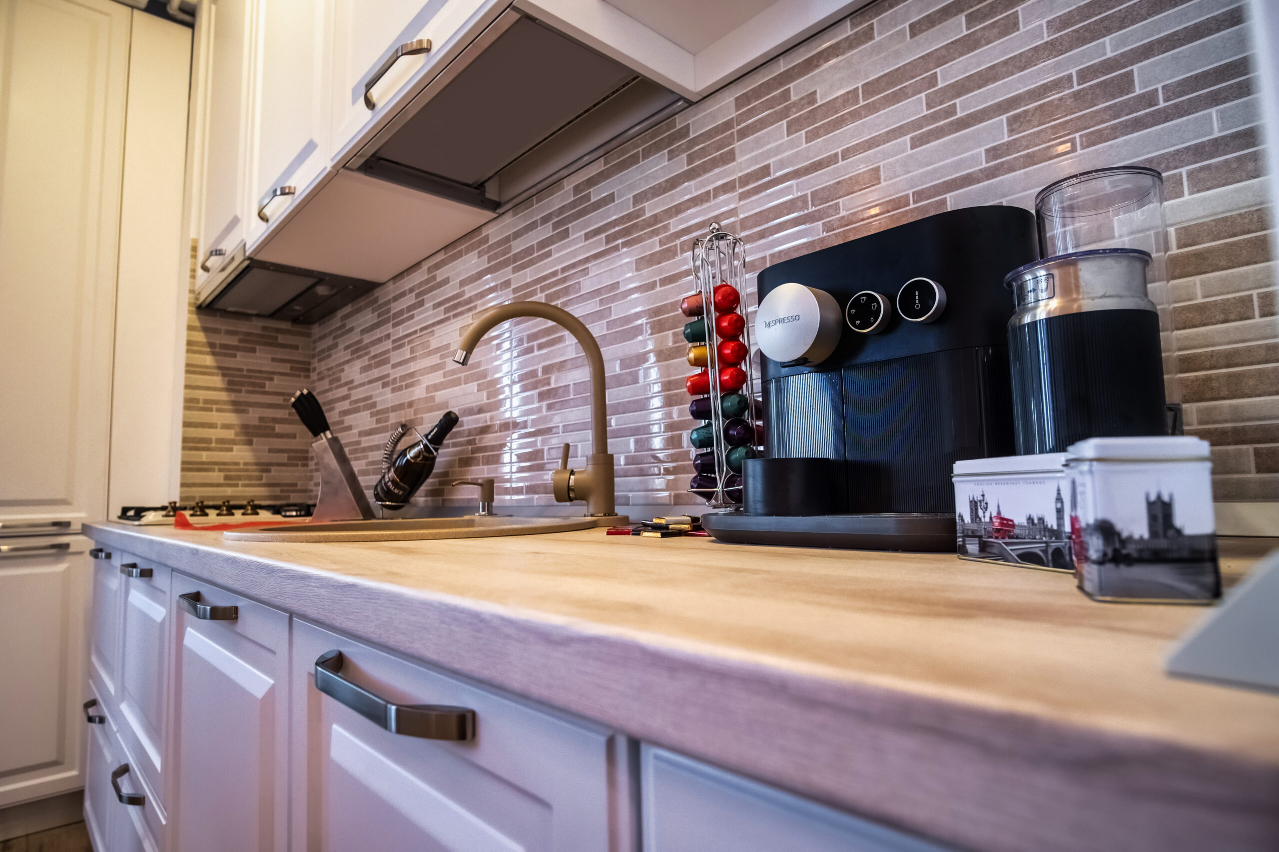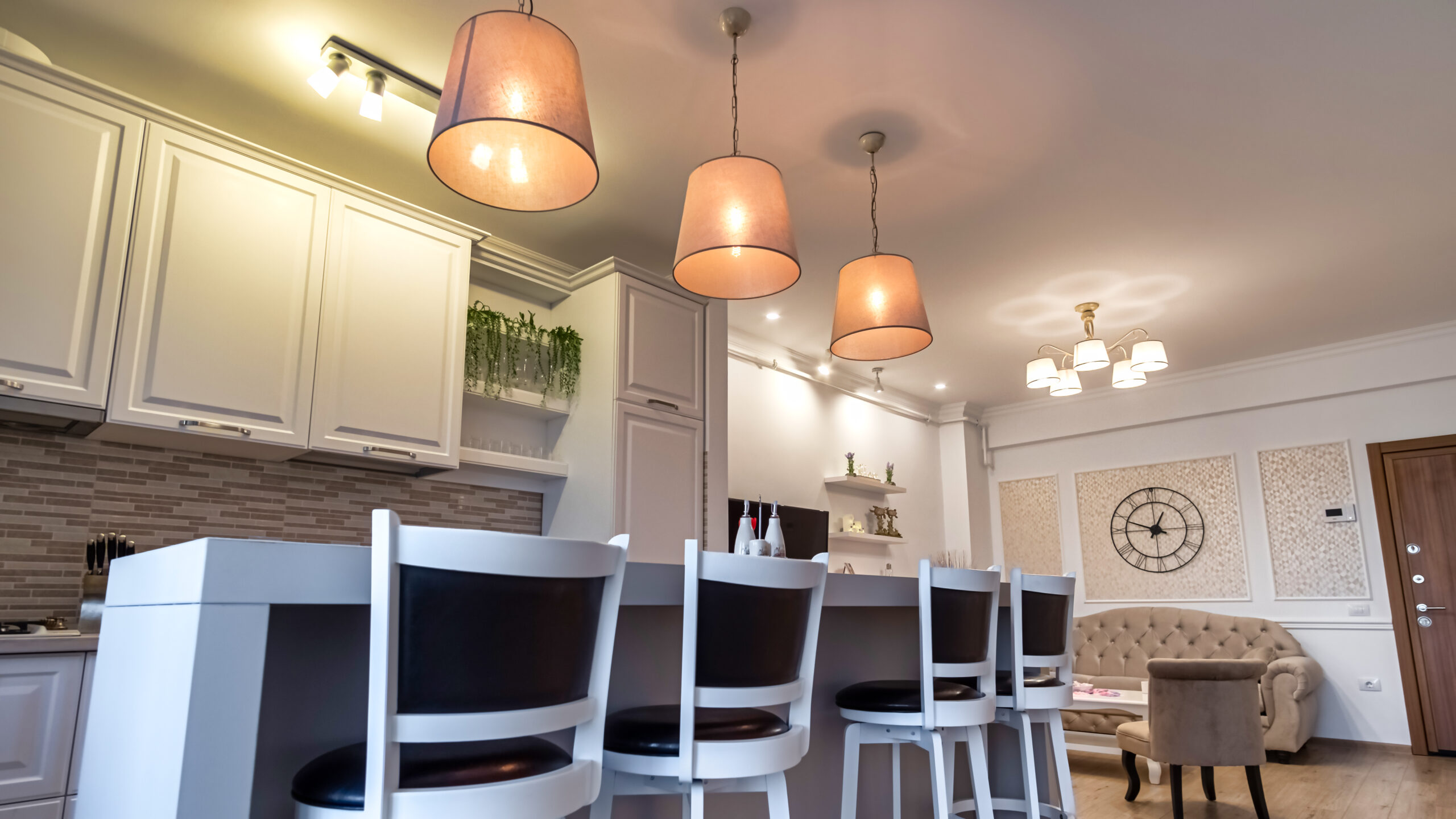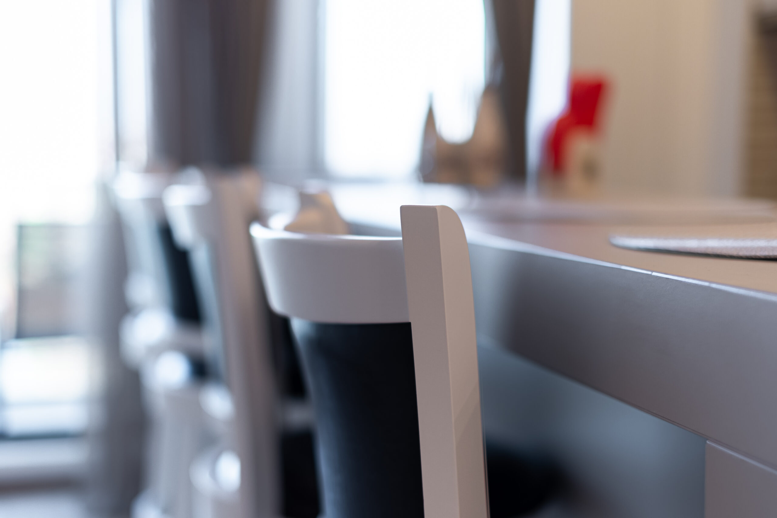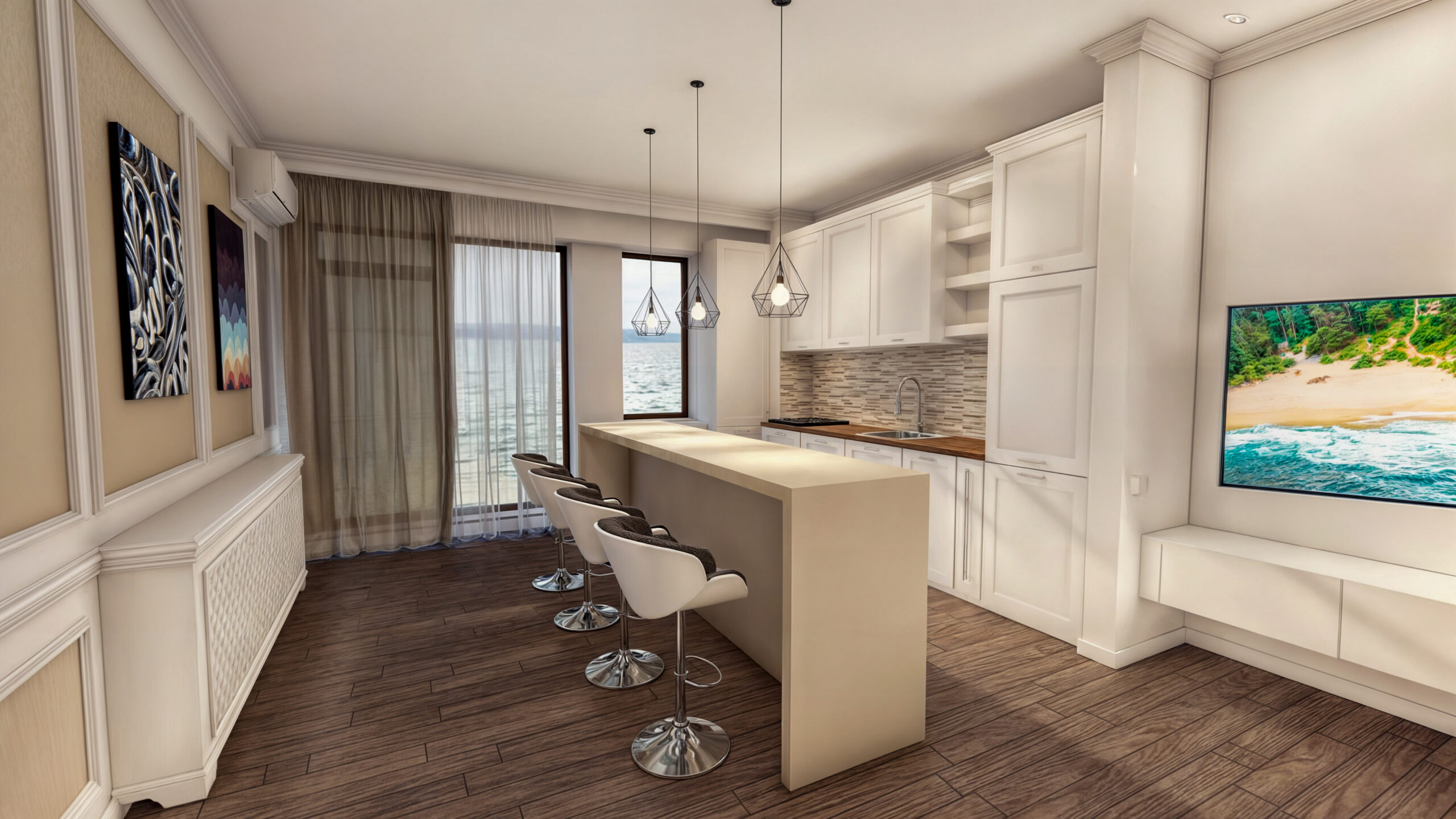 Spațiul bucătăriei este deschis către living și include o insulă cu blat înalt, ideală pentru mese informale sau pentru socializare. Mobilierul bucătăriei este predominant alb, cu linii curate și accente din lemn, iar backsplash-ul este realizat din plăci ceramice în tonuri neutre, ce adaugă textură și interes vizual. Corpurile suspendate și electrocasnicele integrate păstrează o estetică simplă, dar elegantă. Iluminatul modern, reprezentat de trei corpuri suspendate deasupra insulei, aduce o notă contemporană întregului spațiu.