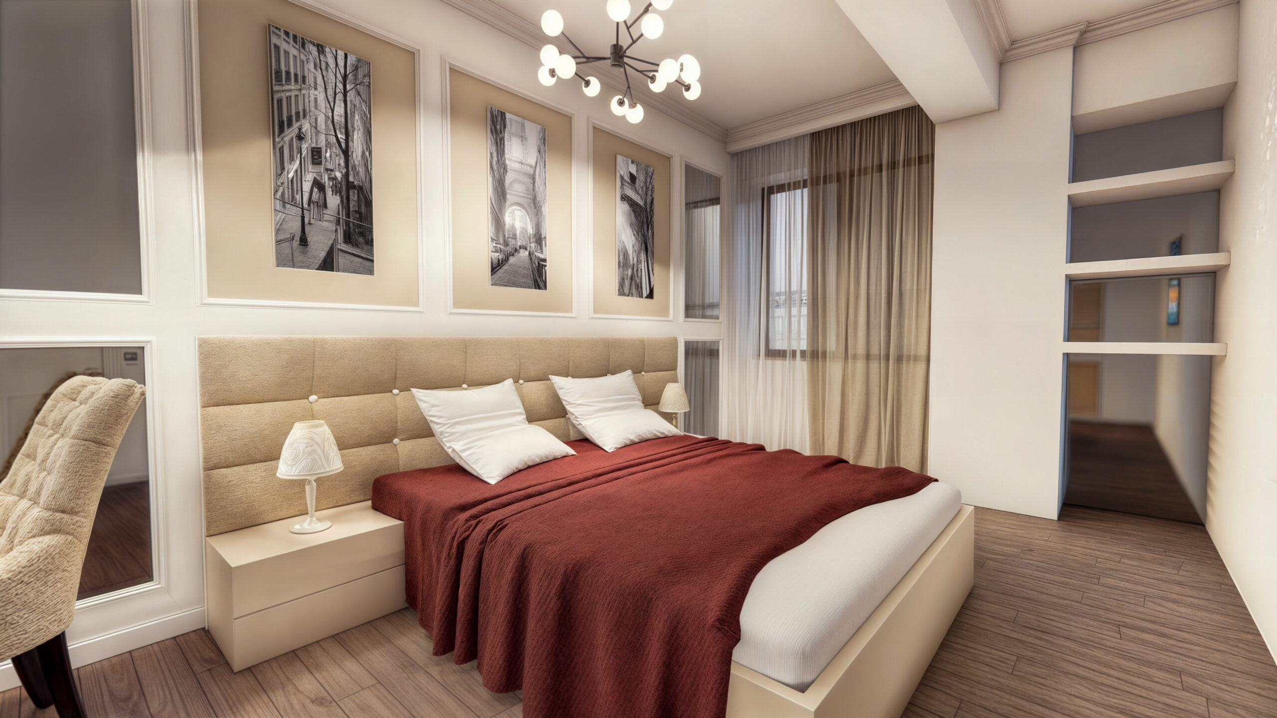 Dormitorul păstrează aceeași temă cromatică, cu un pat tapițat în nuanțe de bej și roșu și un decor cu tablouri monocrome pe pereți. Iluminatul este modern, cu un corp central și o dispunere a luminilor ce adaugă profunzime spațiului. Ferestrele mari continuă să aducă lumină naturală, iar spațiile de depozitare sunt bine integrate în mobilierul camerei, oferind soluții practice fără a afecta estetica.