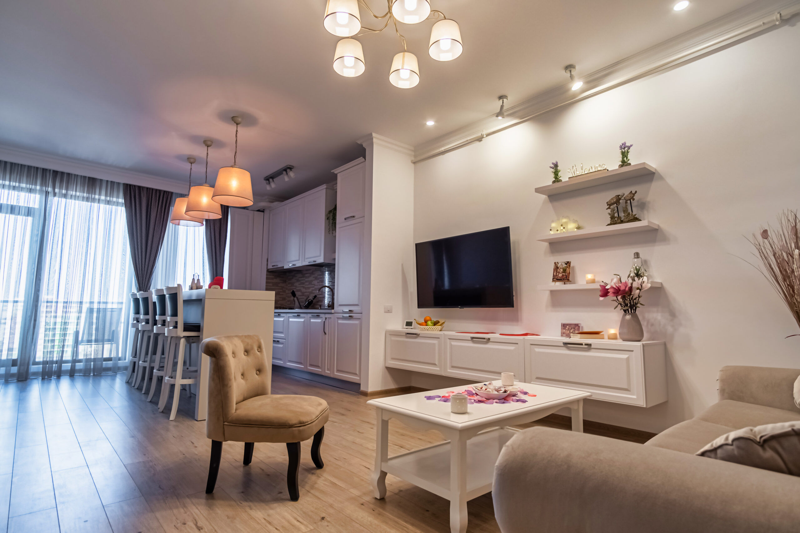 Livingul beneficiază de o fereastră mare ce oferă o vedere spectaculoasă către exterior, accentuând senzația de spațiu deschis. Mobilierul este simplu, cu un colțar confortabil și o masă de cafea din lemn, ce păstrează continuitatea esteticii naturale. Un perete dedicat televiziunii și decorat cu tablouri oferă un punct de interes vizual. Perdelele lungi și draperiile diafane adaugă o notă de rafinament și creează un joc plăcut de lumină.