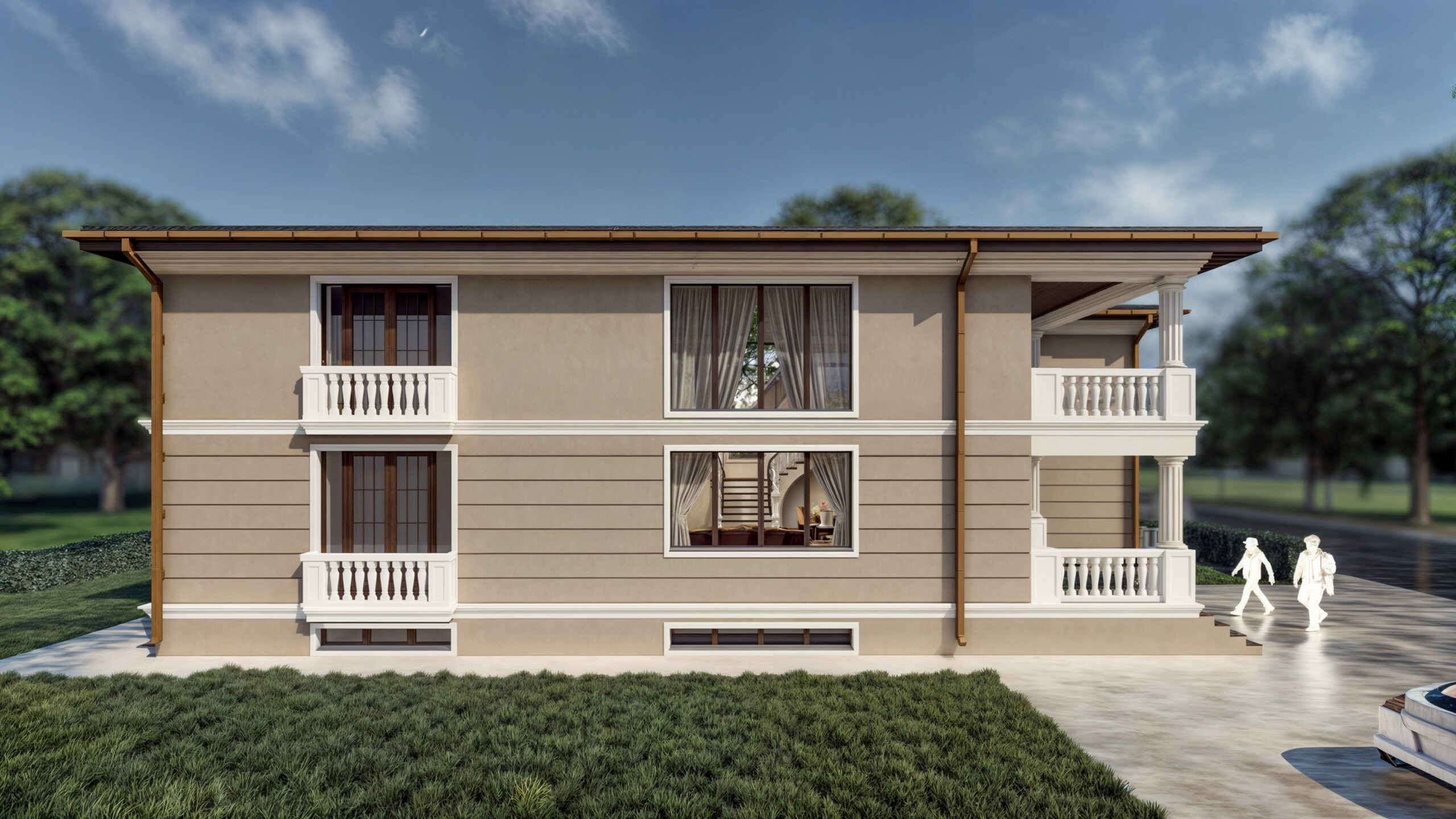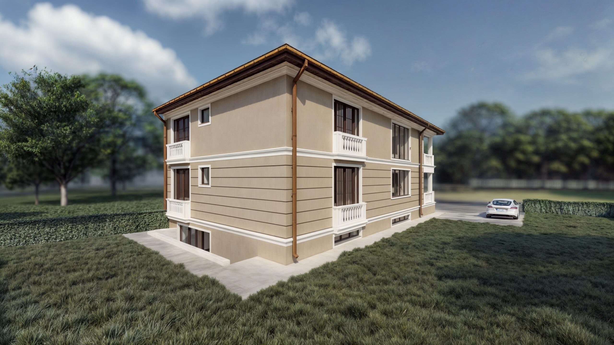 Această locuință individuală este un exemplu remarcabil de îmbinare a elementelor clasice cu stilul modern, creând un spațiu ideal pentru o familie care își dorește confort și eleganță. Proiectul beneficiază de o fațadă elegantă, unde combinația dintre tencuiala bej și detaliile decorative albe conferă casei un aer sofisticat și distinct.