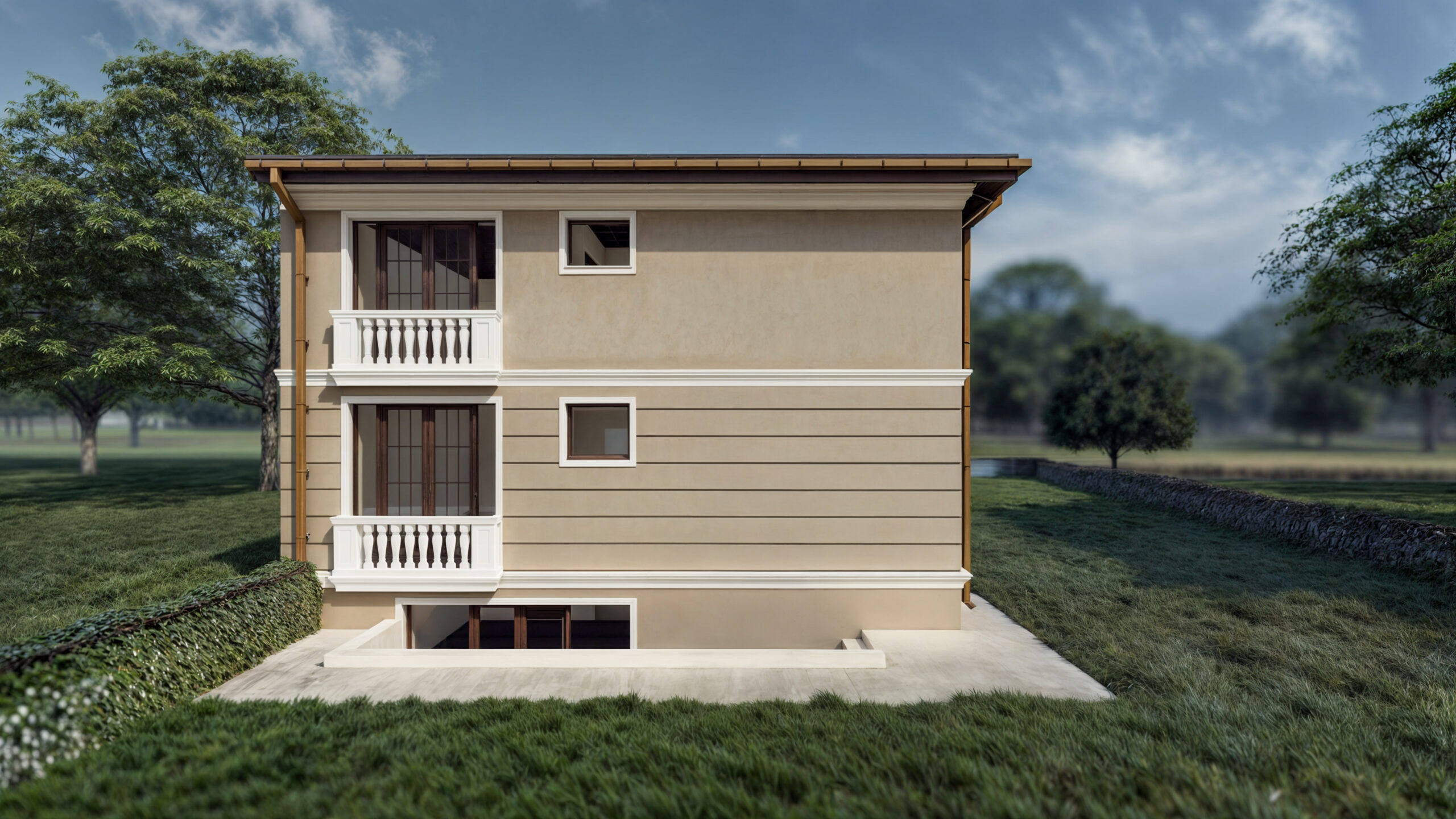 Locuința este bine proporționată, cu ferestre generoase și balcoane care adaugă o notă suplimentară de rafinament. Designul său clasic-modern se reflectă și în detaliile arhitecturale, care creează o armonie între estetică și funcționalitate.