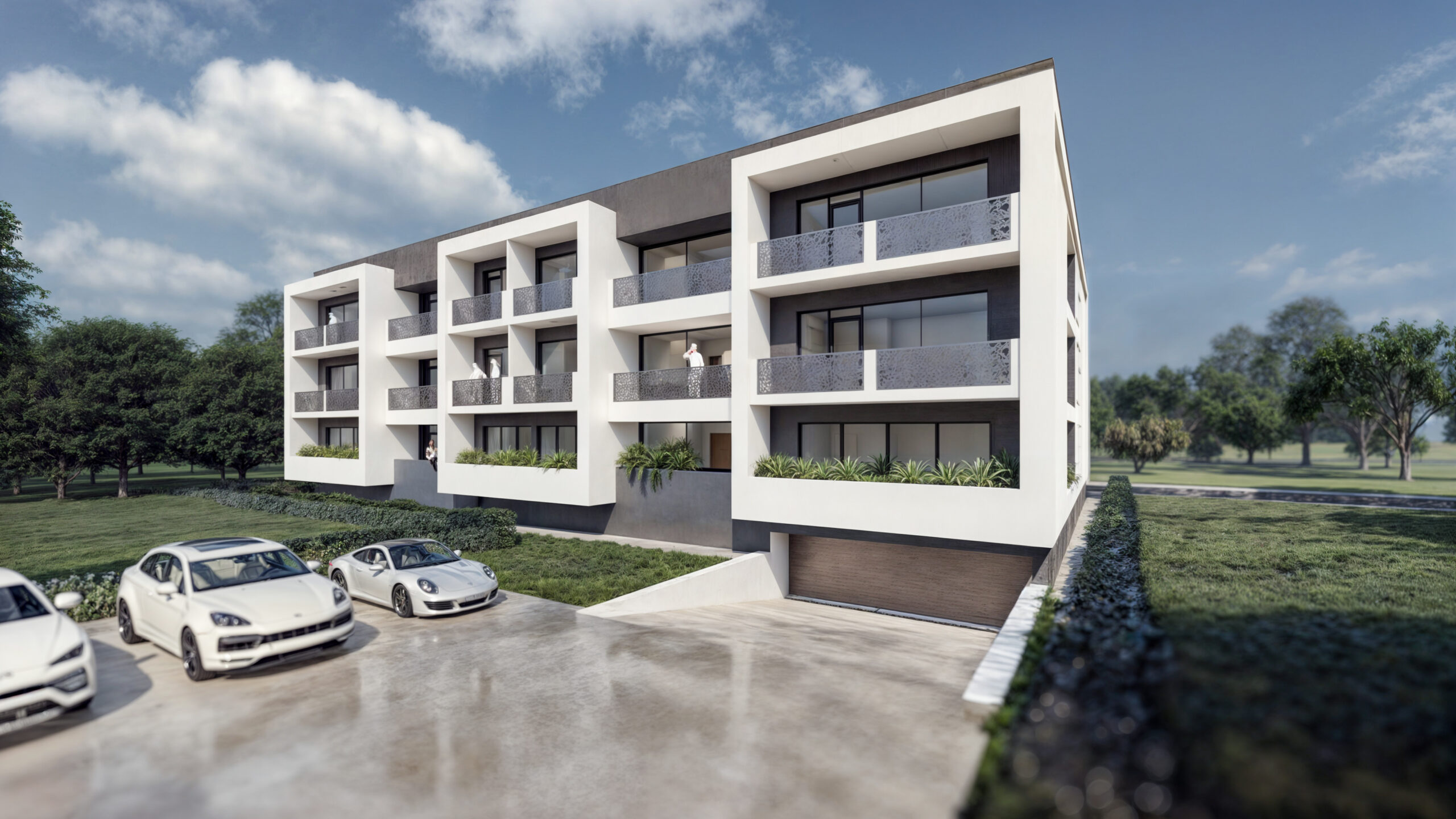 Zona verde, prezentă atât la nivelul terenului cât și pe terasele superioare, aduce un plus de relaxare și confort pentru locatari, contribuind la crearea unui mediu plăcut și sustenabil. Parcările sunt împărțite între subsol și nivelul solului, totalizând 42 de locuri, asigurând astfel confortul rezidenților și vizitatorilor.