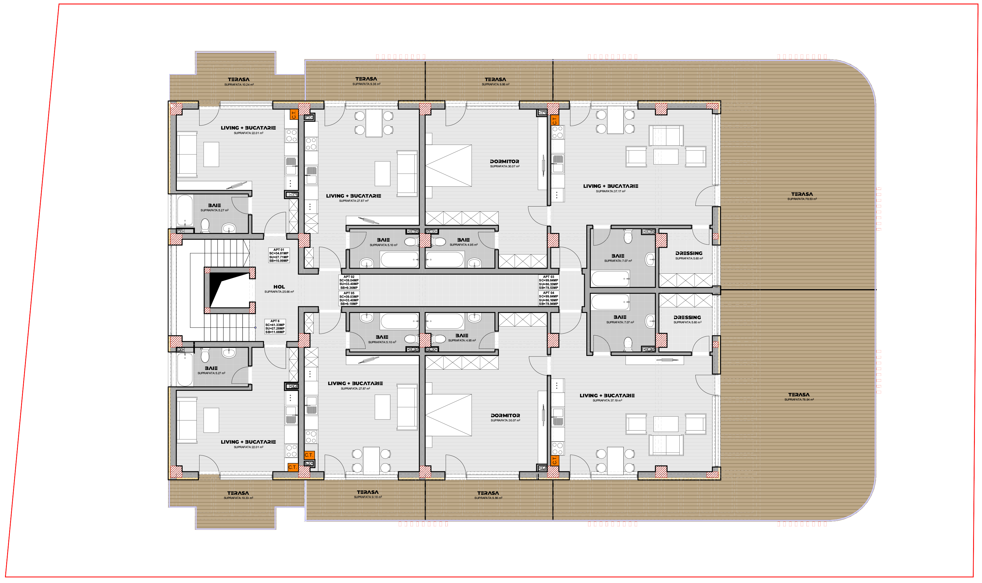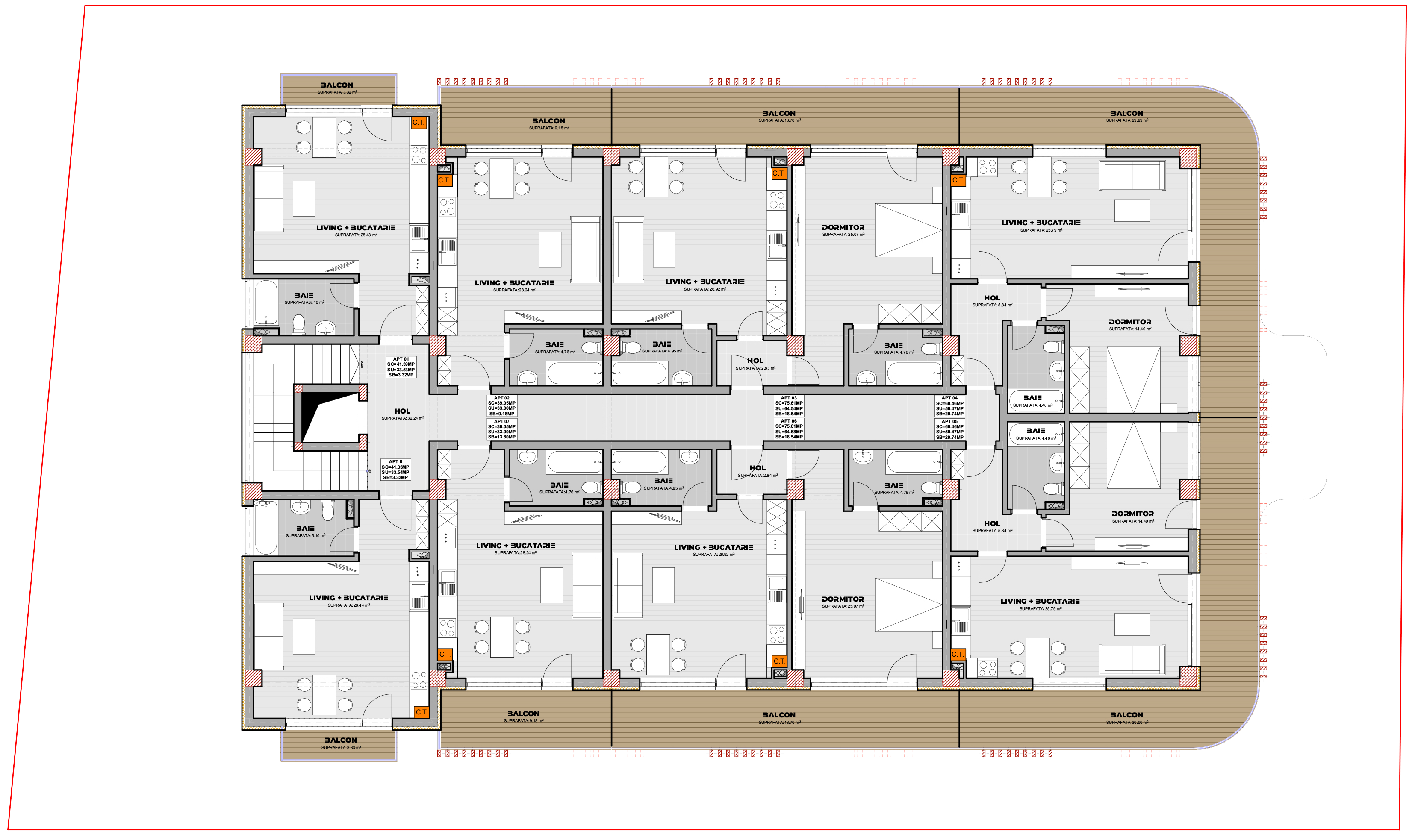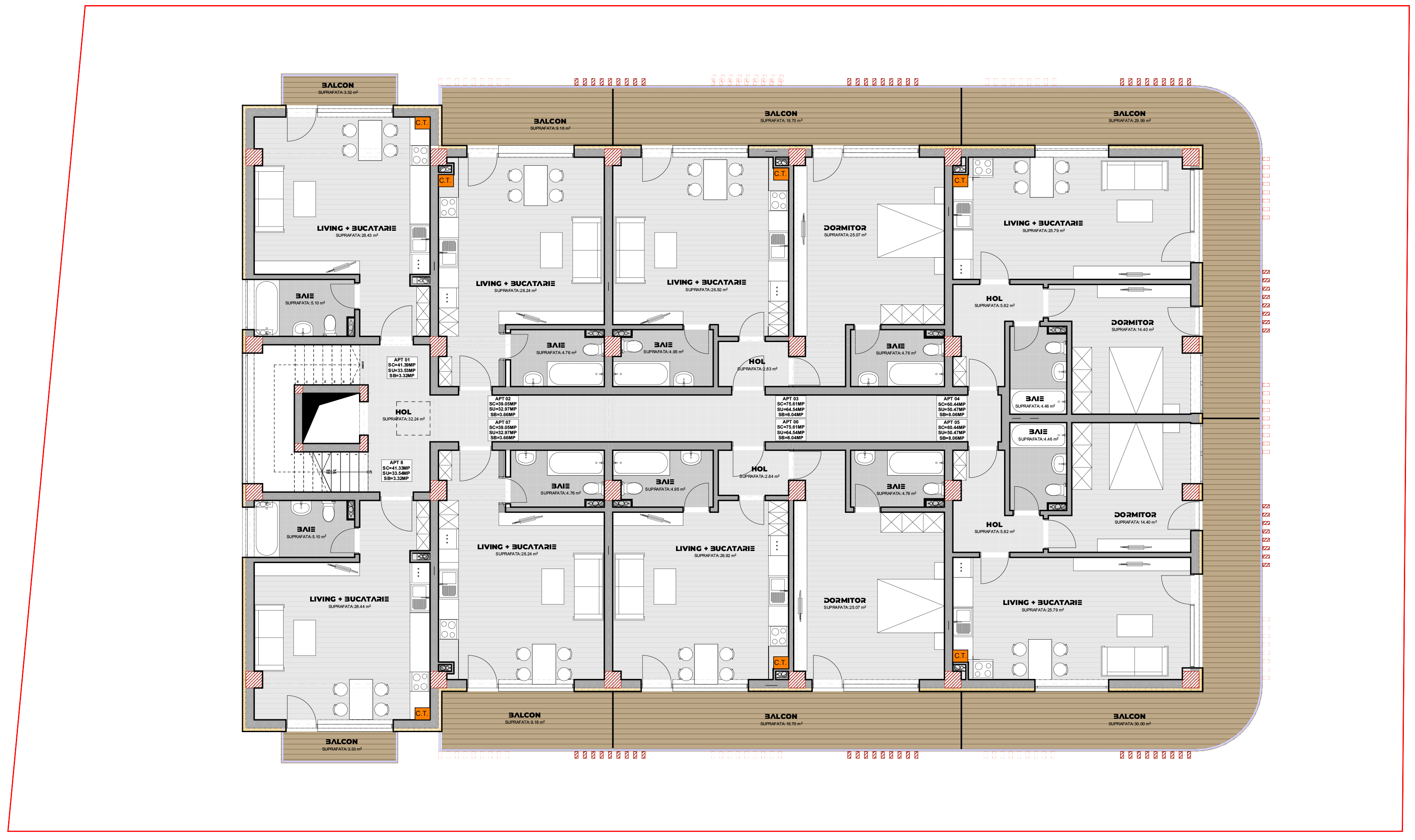 Acest proiect propune modificarea unui imobil de locuințe colective, prin supraetajare de la P+4E la P+5E, precum și recompartimentarea interioară, incluzând modificări ale fațadelor. Clădirea este situată pe un teren de 1000 mp și integrează un spațiu comercial la parter. Proiectul urmărește maximizarea spațiului util și eficientizarea utilizării terenului, păstrând totodată un design modern și funcțional. Acest complex oferă un total de 38 de unități locative și 26 de locuri de parcare, organizate în incinta proprietății, oferind astfel un echilibru între confort și accesibilitate pentru rezidenți.