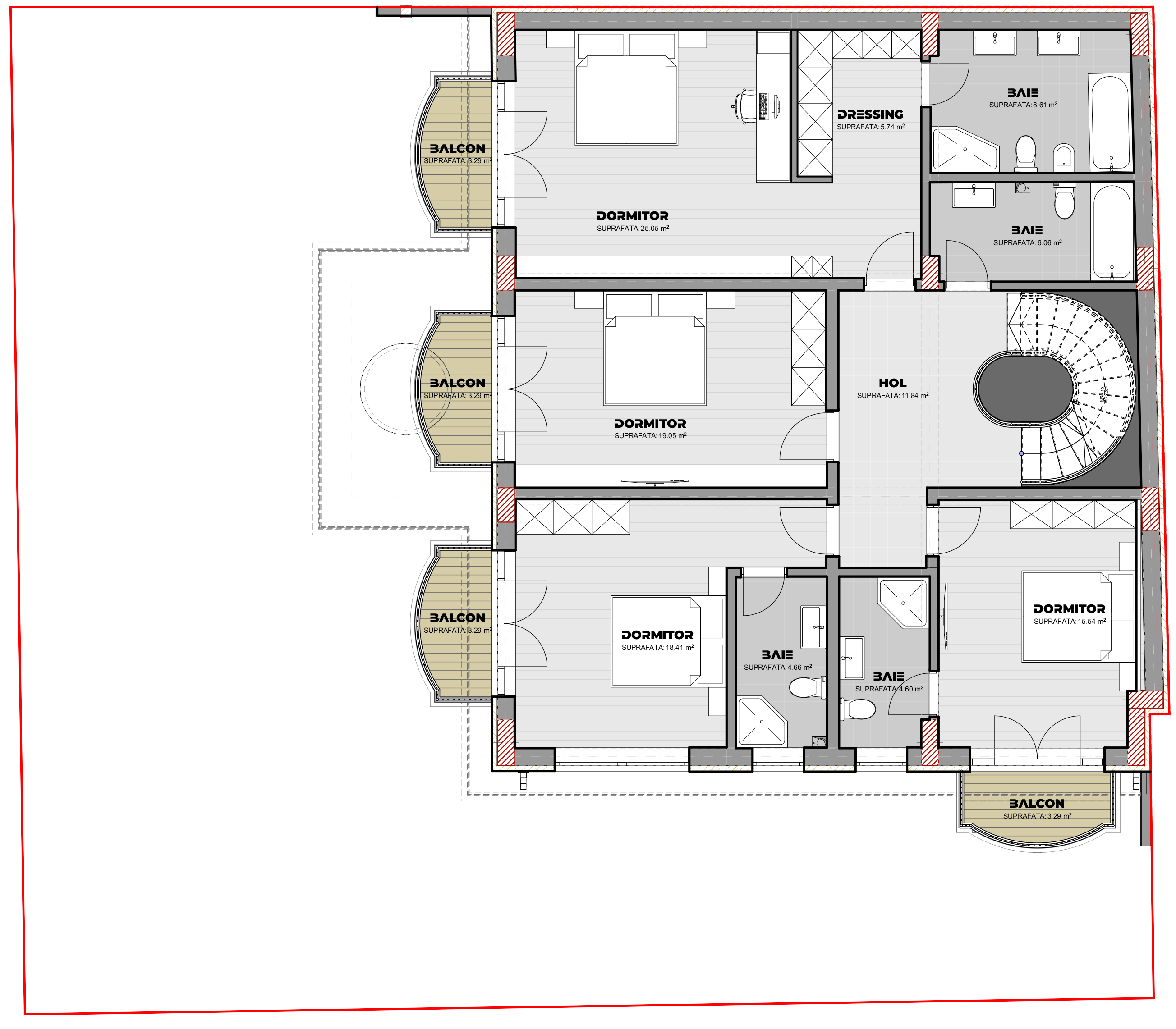 Designul exterior îmbină linii moderne cu detalii funcționale, punând accent pe suprafețele vitrate care oferă lumină naturală abundentă. Spațiile locative sunt generoase, bine organizate și optimizate pentru nevoile familiei contemporane. Biroul de la parter este accesibil direct din exterior, facilitând interacțiunea profesională fără a compromite intimitatea spațiului de locuit. Zona de grădină și spațiile verzi aduc un plus de relaxare și estetică.