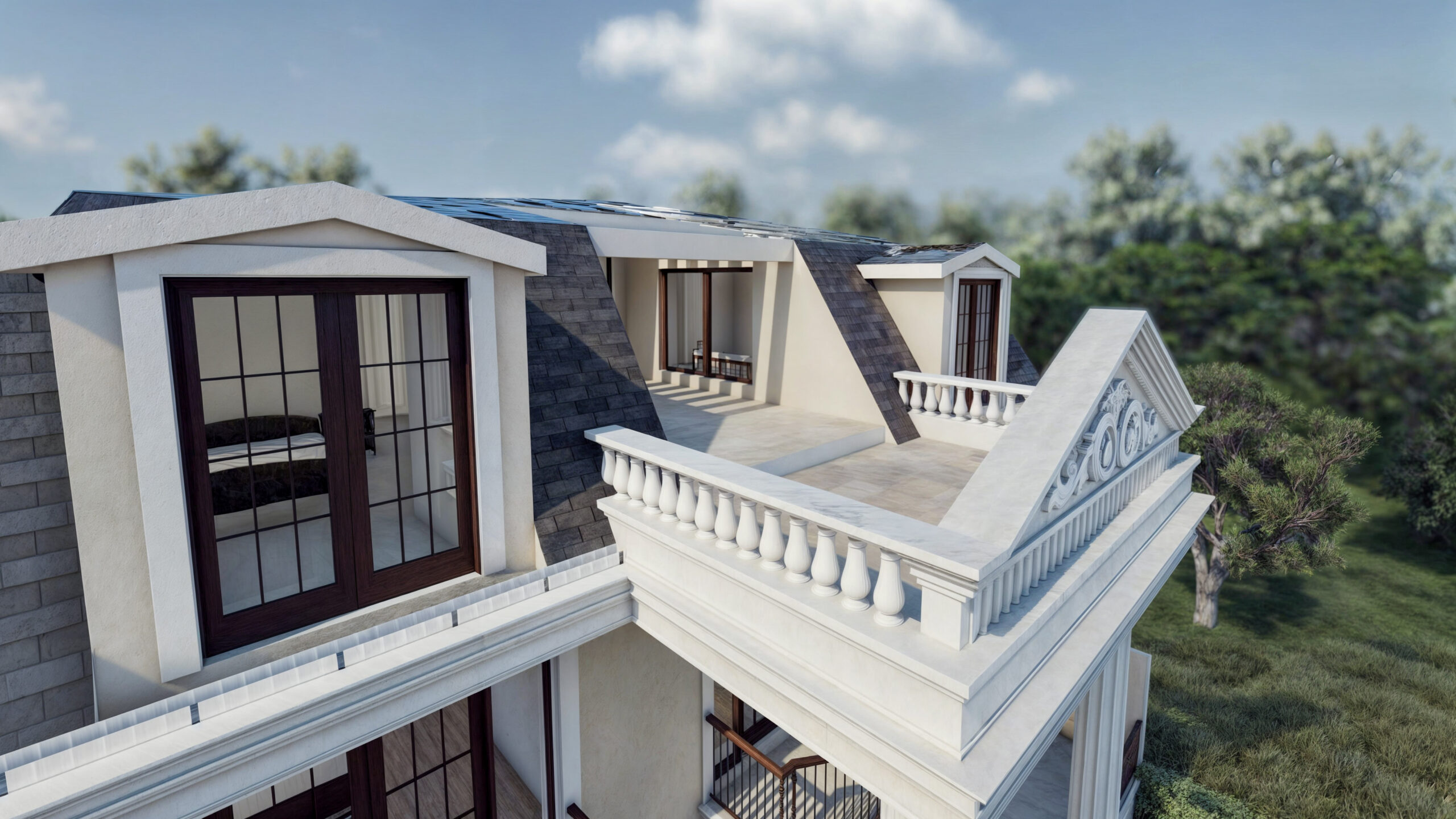 Această locuință individuală modernă, cu regim de înălțime parter + etaj + mansardă (P+1E+M), este proiectată pentru a combina un spațiu de locuit confortabil cu un biro