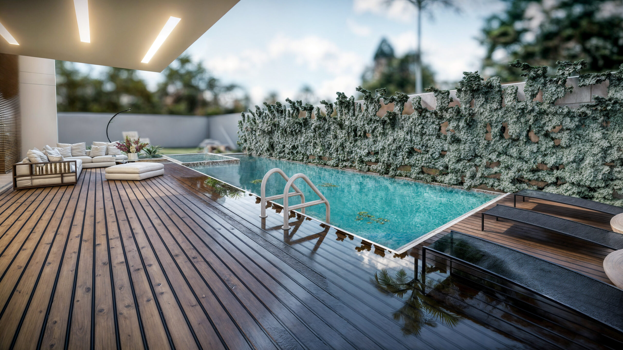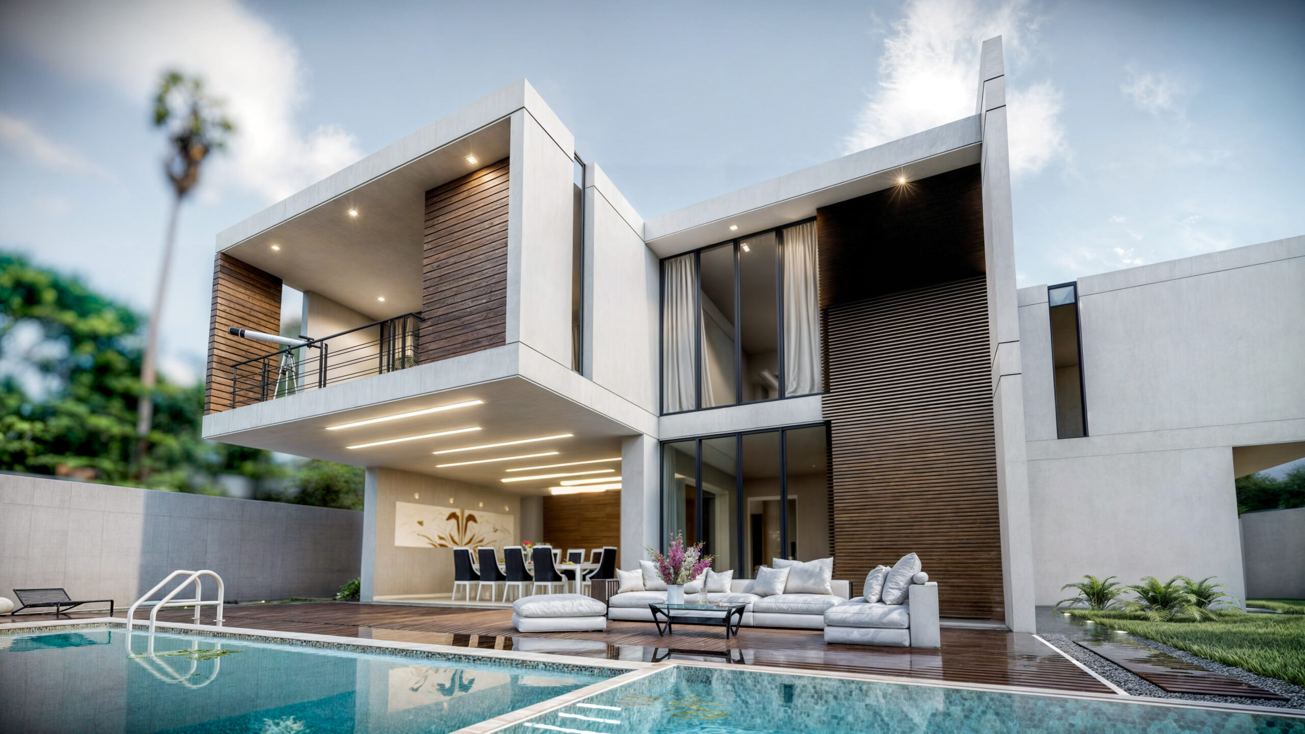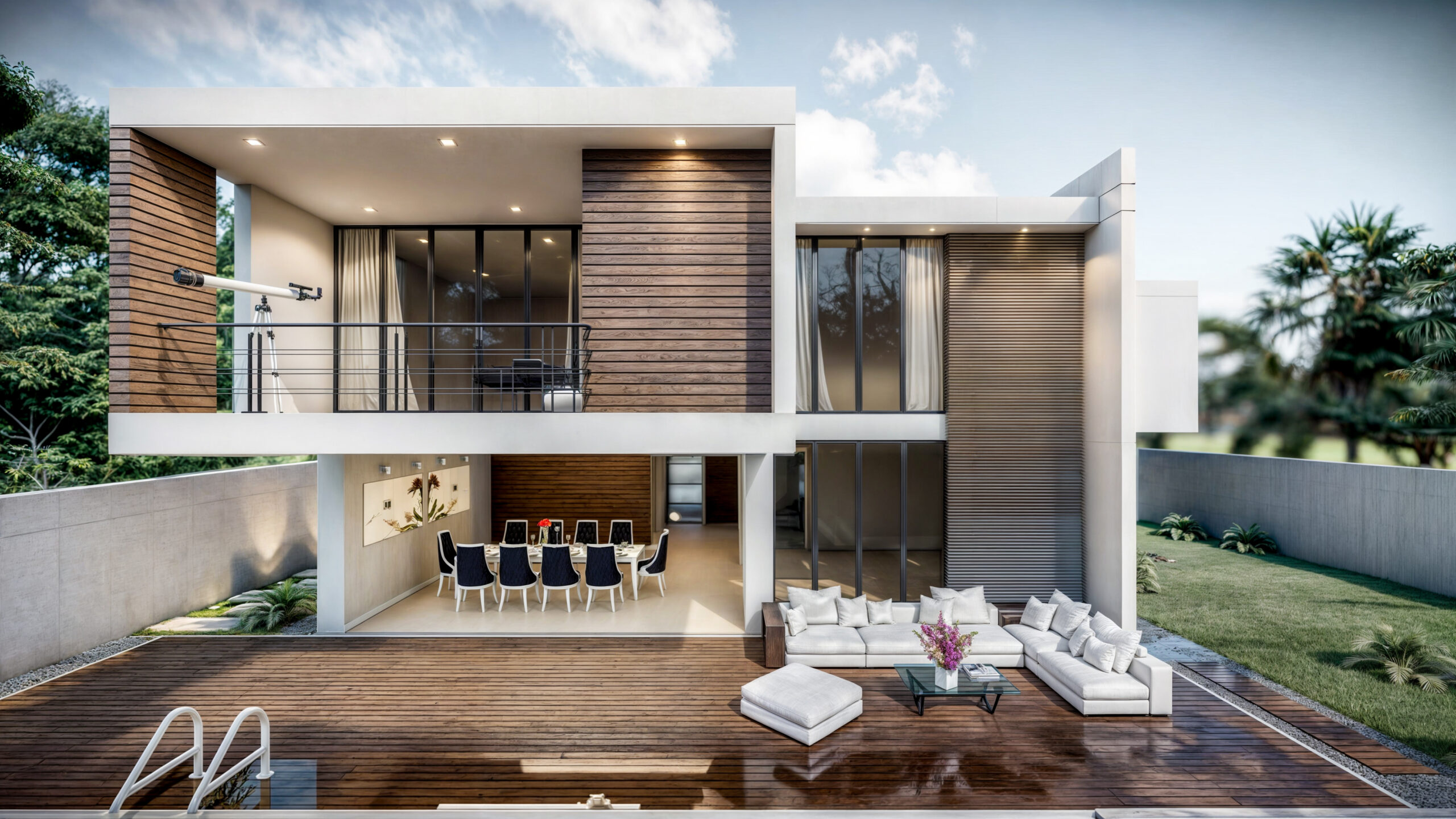 Designul casei este caracterizat de linii drepte și volume clare, cu un accent puternic pe spațiile de relaxare exterioare. Terasa generoasă, acoperită parțial, este conectată direct cu piscina privată și zonele de relaxare, creând un loc perfect pentru socializare sau relaxare.
