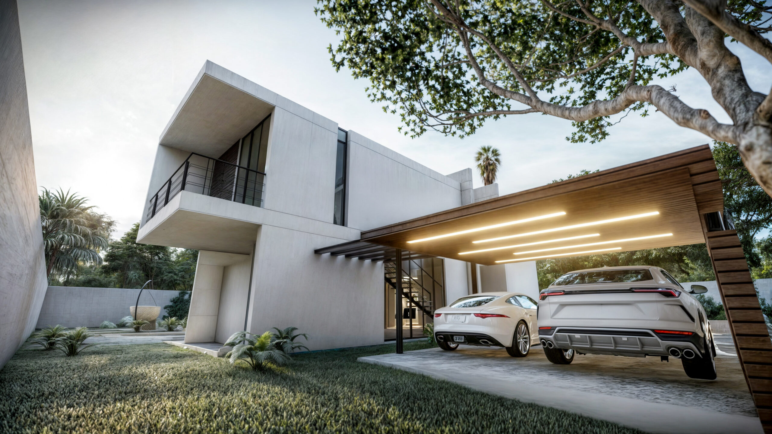 La etaj, balconul spațios oferă o priveliște panoramică asupra curții și piscinei, iar spațiile private din interior sunt completate de dotări moderne și finisaje de înaltă calitate. În partea din față a casei se află un carport modern pentru două mașini, perfect integrat în designul general al construcției.