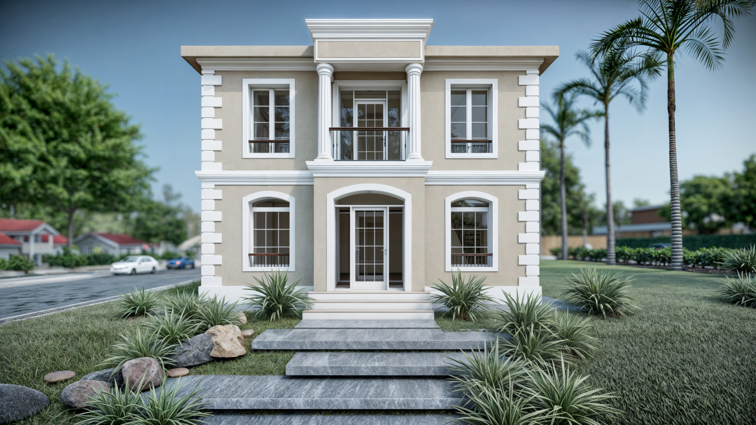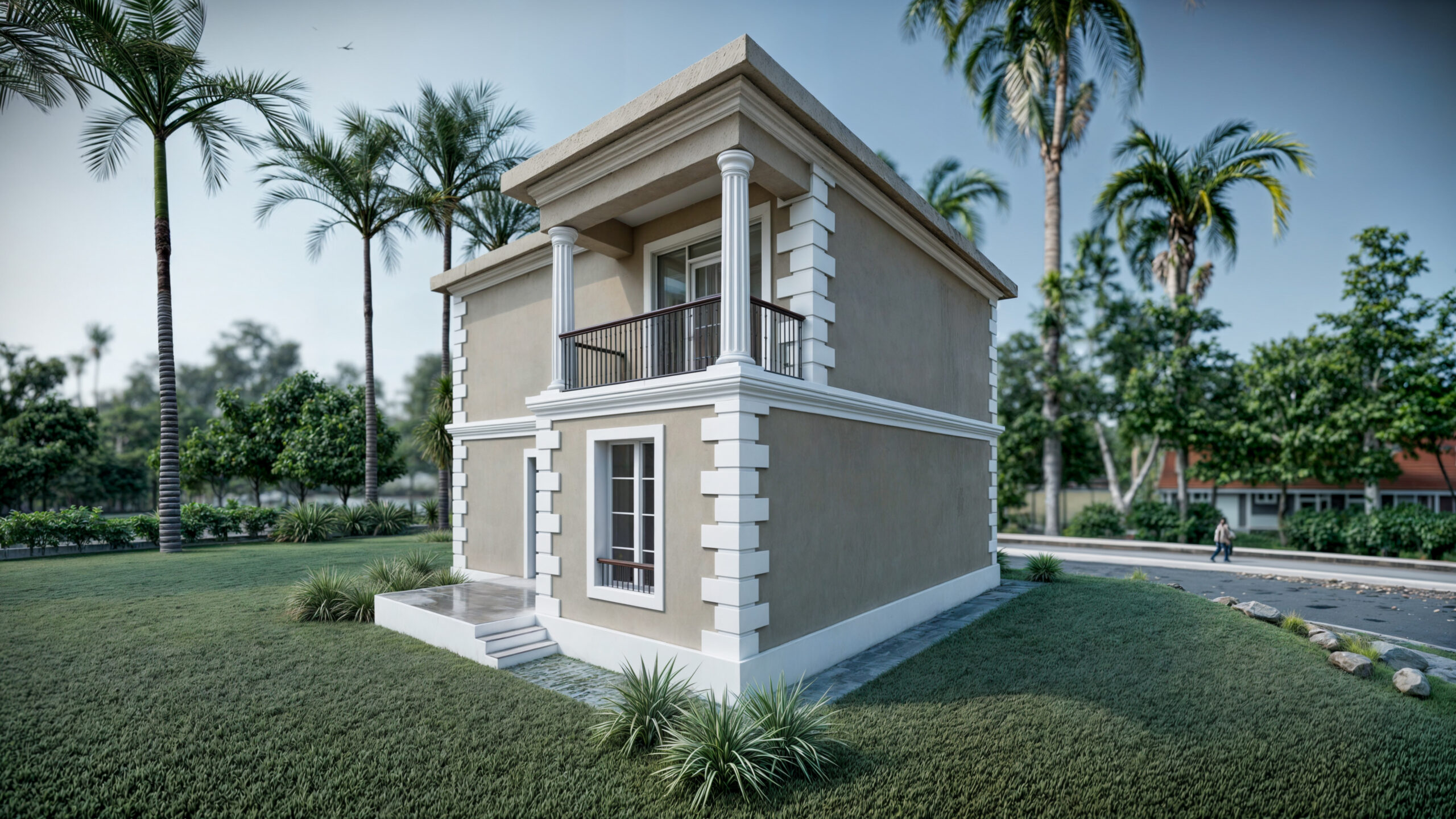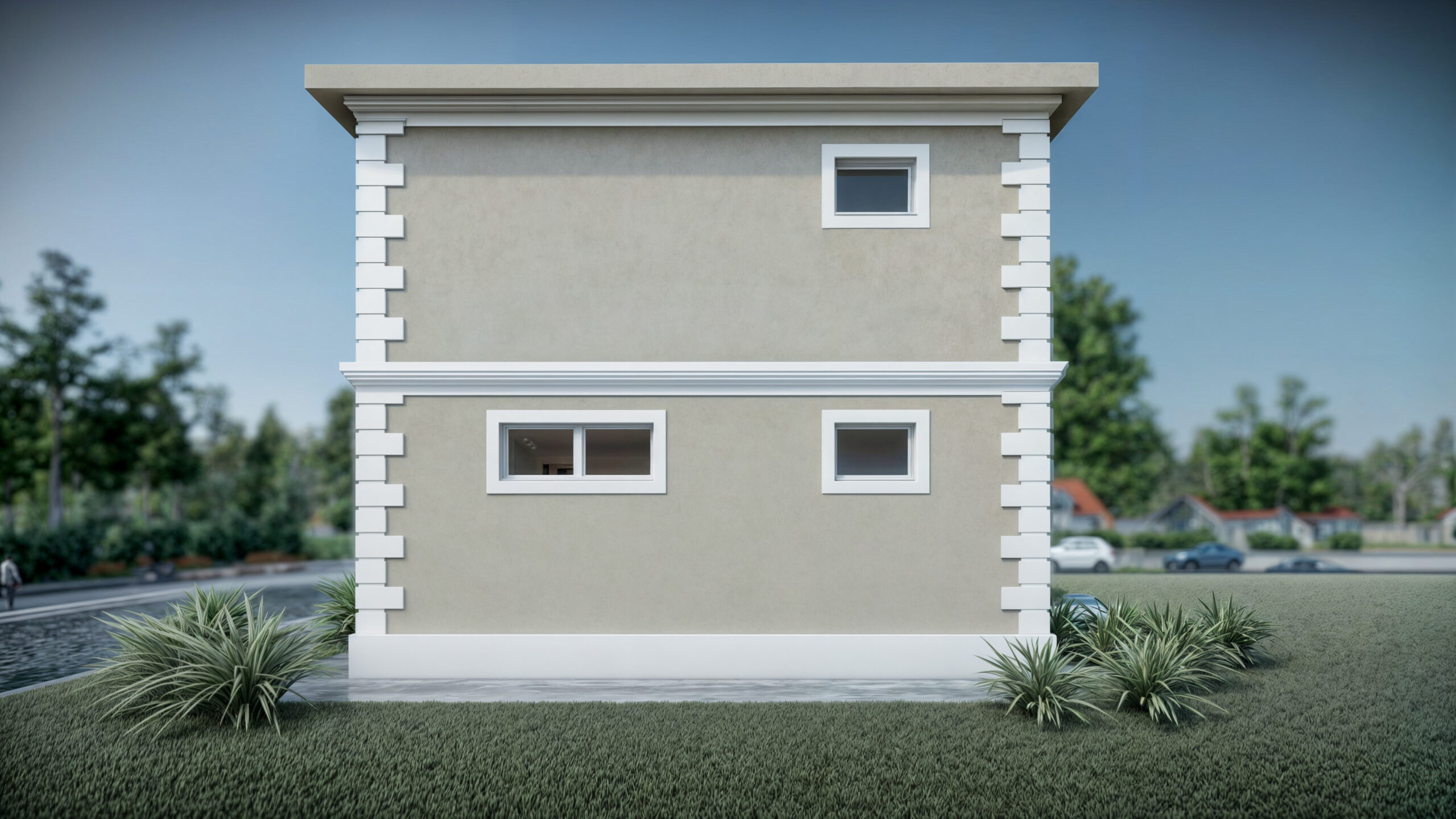 Exteriorul clădirii îmbină elemente de design modern cu materiale durabile, iar ferestrele mari permit pătrunderea luminii naturale, creând o atmosferă deschisă și luminoasă în interior. Parterul găzduiește o zonă de zi spațioasă, perfect conectată cu exteriorul, facilitând o tranziție lină între interior și grădină. La etaj, dormitoarele beneficiază de confort și intimitate, fiecare având acces direct la balcoane.