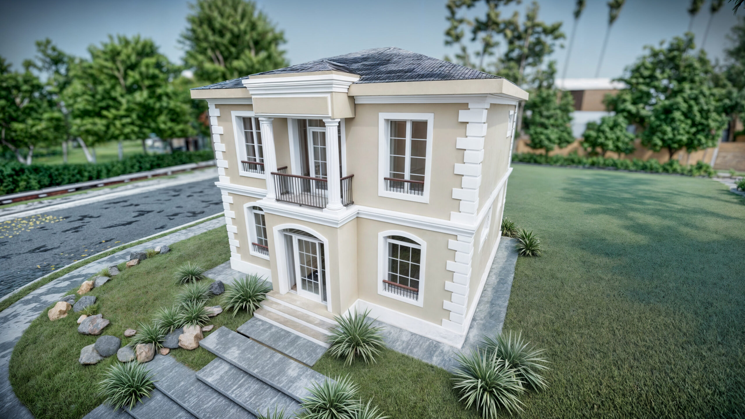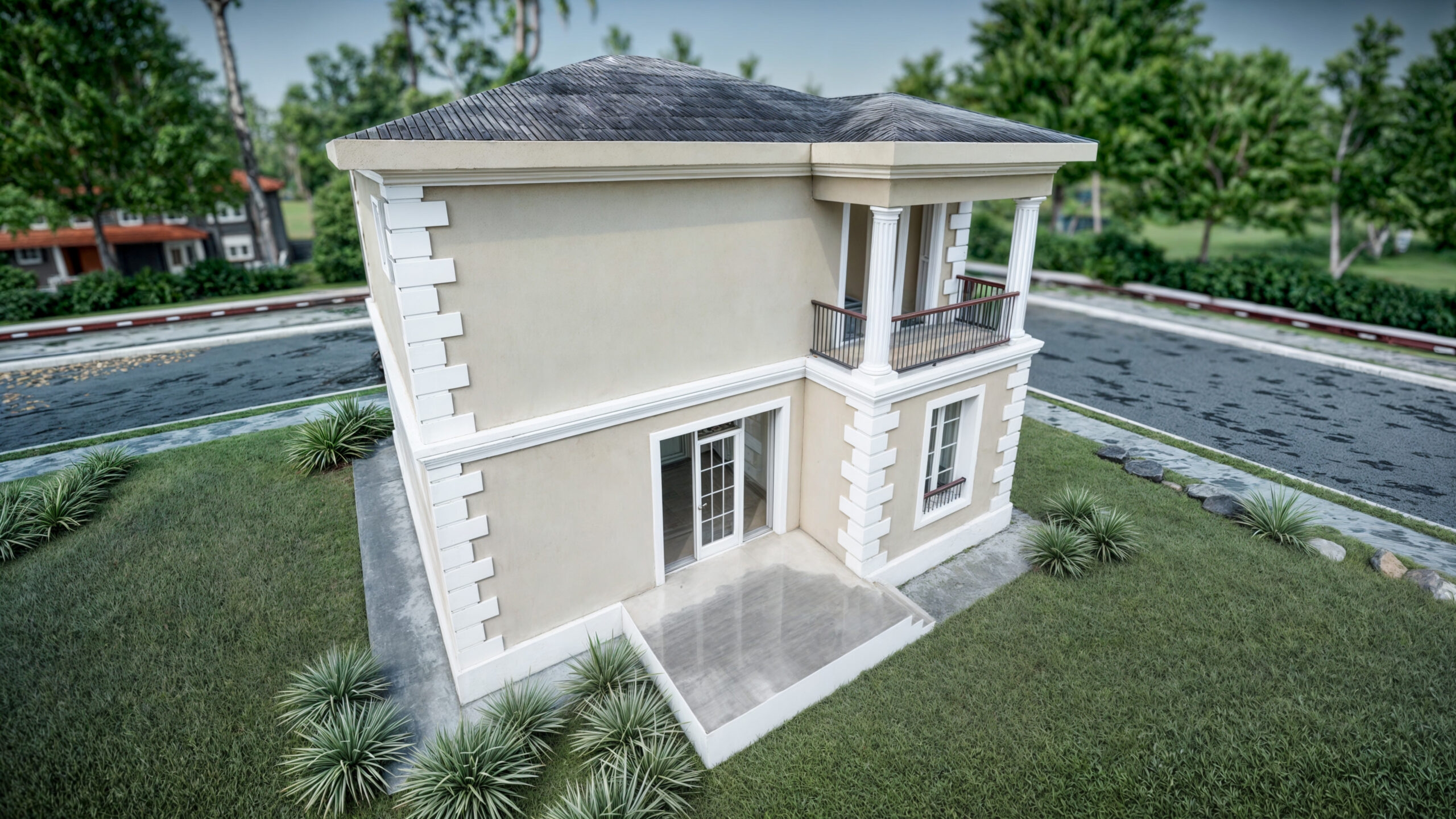 Designul peisagistic al grădinii completează conceptul locuinței, oferind un spațiu de relaxare în aer liber, perfect pentru activități recreative și socializare.
