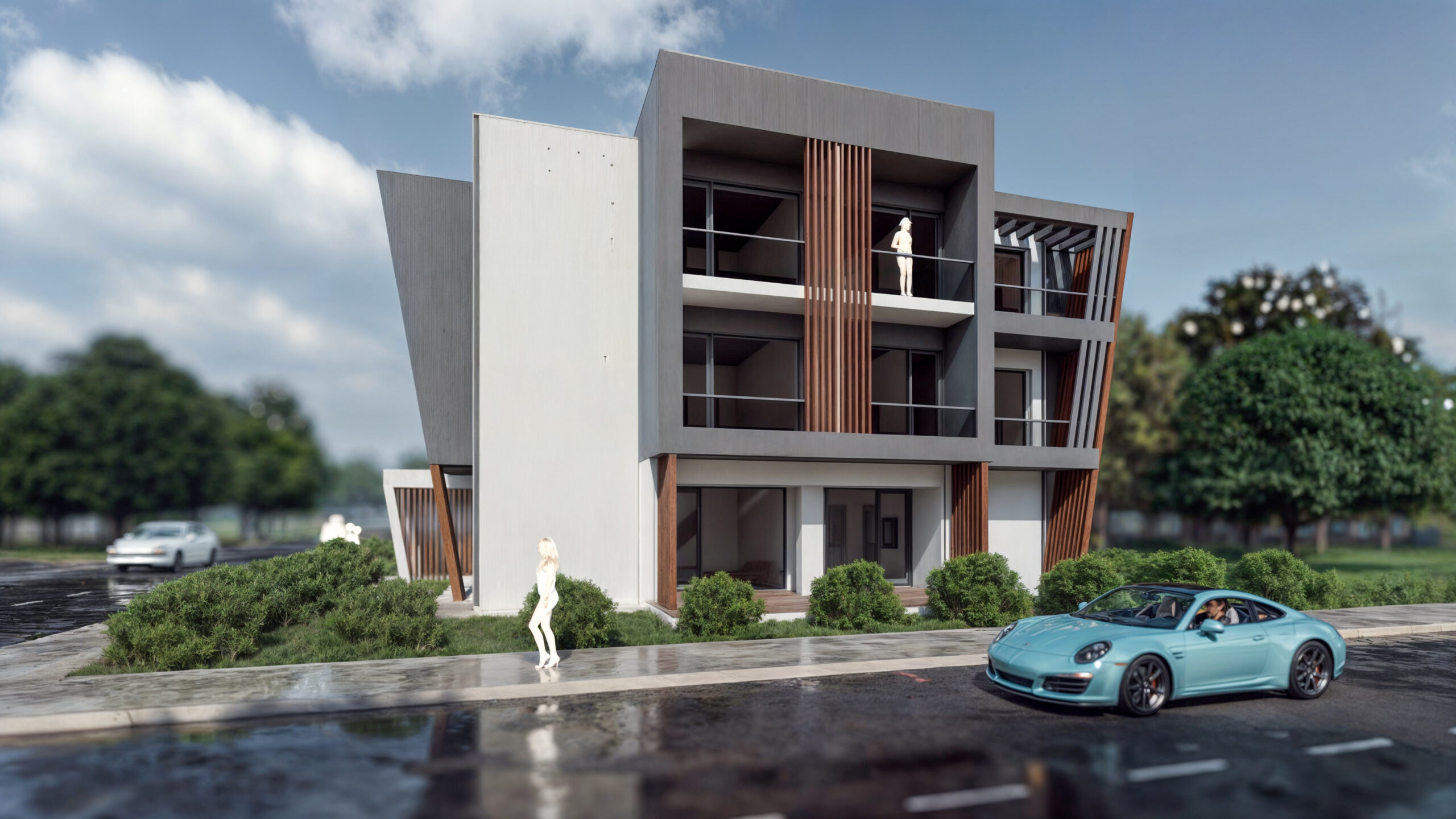 Proiectul „Locuințe de vacanță P+2E” se evidențiază printr-un design contemporan și elegant, fiind ideal pentru cei care caută un refugiu modern în mijlocul naturii. Fațadele clădirii sunt realizate din materiale durabile, cu accente de lemn și suprafețe vitrate mari, asigurând o estetică plăcută și o conectare vizuală armonioasă cu peisajul înconjurător. Elemente decorative verticale din lemn aduc un plus de dinamism fațadelor, creând un joc interesant de umbre și lumini.