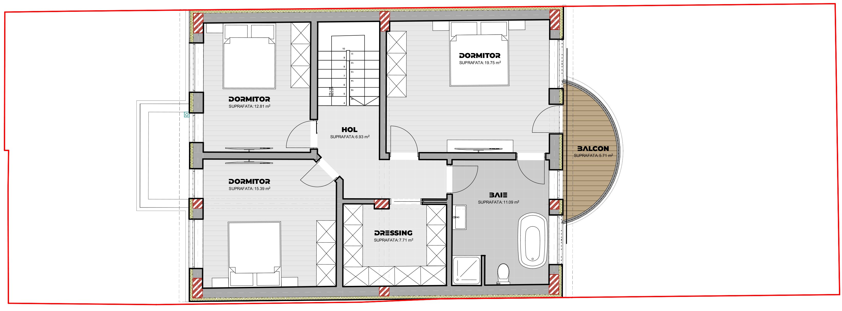 Exteriorul locuinței prezintă detalii arhitecturale clasice, dar reinterpretate într-o manieră contemporană. Ferestrele mari arcuite, precum și fațada simplă și elegantă, conferă clădirii o prezență distinctă, în timp ce culorile neutre și materialele durabile utilizate sporesc farmecul general. La parter, zona de zi deschisă se extinde către terasa din spatele casei, oferind un spațiu de relaxare suplimentar pentru familie și prieteni. Dormitoarele de la etaj beneficiază de lumină naturală din abundență și acces direct la balcoane generoase.